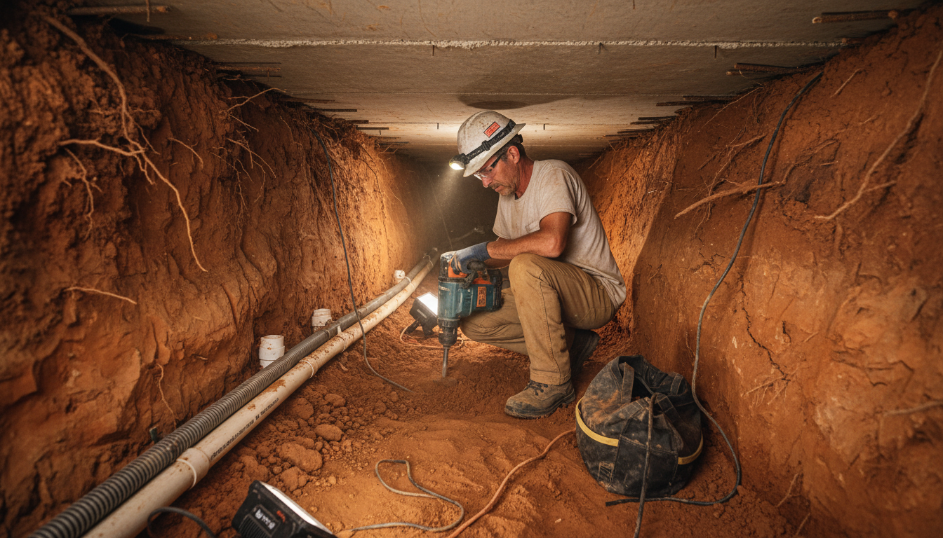 Tunneling & Drainage provides an effective way to access and repair foundation and plumbing issues beneath a slab without cutting through interior flooring. Instead of breaking through floors inside the home, controlled tunnels are carefully excavated from the outside perimeter to reach problem areas under the slab. This approach helps preserve interior finishes, reduces disruption to daily living, and allows technicians to work directly where repairs are needed while maintaining the structural integrity of the property.